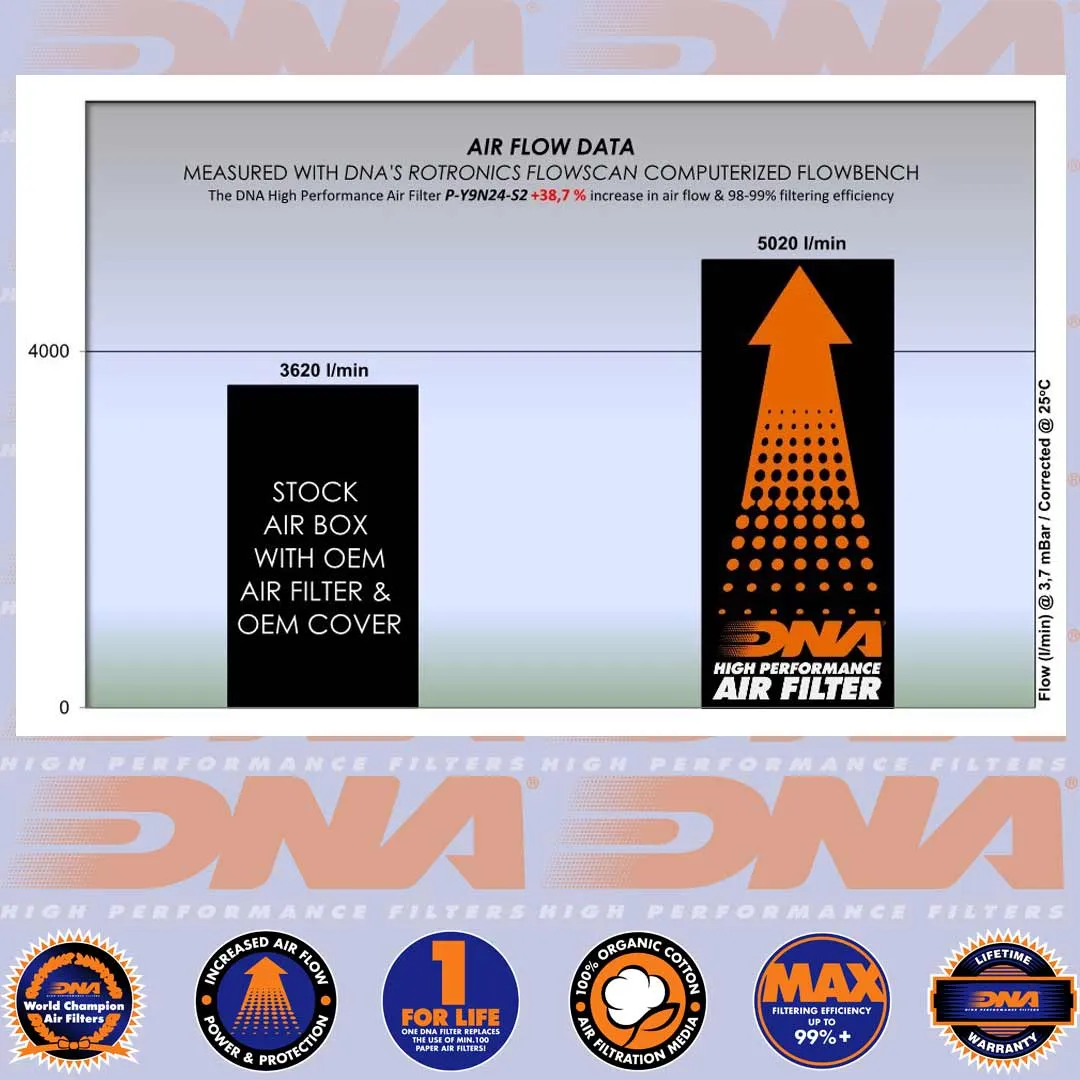 The airflow of this new DNA Stage 2 air filter kit is +38.7% more than the stock YAMAHA air box with OEM air filter & stock air box cover applied!