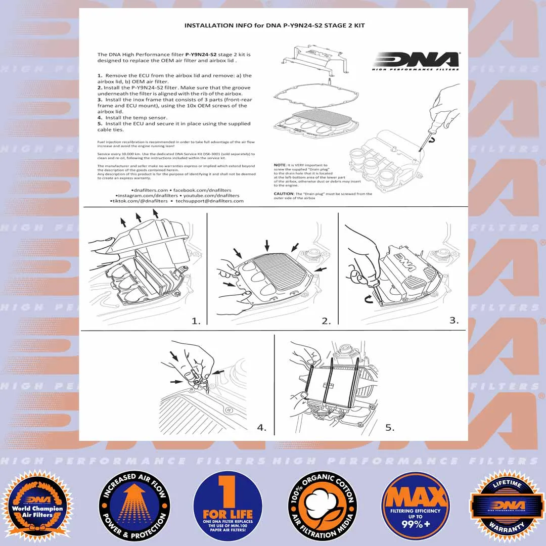 This Stage 2 kit is designed to replace the stock plastic air box top cover and OEM air filter. With the use of P-Y9N24-S2 there is no need to use the OEM air filter or DNA P-Y9N24-01.