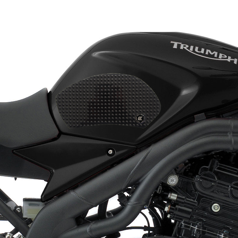 Eazi-Grip EVO - the non-abrasive high traction tank grips Triumph Speed Triple EVO Tank Grips includes Tank Grips, left and right side, black IPA cleaner Fitting Instructions Manufactured in the UK from high quality polyurethane, these traction pads are designed to be applied to the fuel tank recesses next to the riders knees and come pre-cut to size. High quality polyurethane with soft but durable domed surface Improves rider control in corners and under braking with minimal effort Non-abrasive - kind to riders clothing and leathers Cut to size - quick and easy to apply - instructions and IPA surface cleaner provided Application Peel back part of the release liner then press the tank grip firmly onto the tank and slowly peel back the liner whilst applying the grip. Push down the surface and take care not to trap air bubbles as you go. Allow 48 hours for the adhesive to fully bond before using the grips. Use an IPA cleaner to prepare surface area NO methylated spirits/petrol/lighter fluid etc. as these leave behind a thin, greasy residue. For best results ensure prepared surface is above 10oC. Also available - Eazi-Grip PRO Tank Grips Race developed in BSB and Isle of Man TT for the more aggressive race or track-day rider, Eazi-Grip PRO Tank Grips features a unique, circular embossed pattern, with a flatter, lower profile that combines excellent grip and durability with exceptional rider feel. Eazi-Grip PRO Tank Grips have been specifically designed to allow greater movement on the bike whilst giving high levels of grip when needed through corners and under heavy braking. Designed, developed and manufactured in the U.K. Hint: Black grips look better than clear on a black tank, where clear grips can appear a little blue. Black grips can also look better than clear on a pure white tank, where clear grips can appear a little yellow. Clear grips are optimised for colours other than black and pure white. Suitable for Triumph Speed Triple 2005 - 2010 models only Part No. EVO810BL