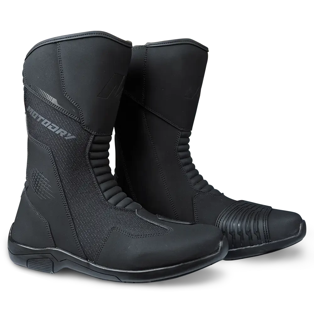 Touring boots designed to go the distance—abrasion-resistant, double-stitched outer, with added stretch panels that move with you, keeping you comfortable on those long journeys. The secure zip and Velcro closure makes fitting easy, while a waterproof & breathable lining, along with a pre-formed orthopaedic anti-vibration footbed keep things cool and comfortable. Subtle reflectives and reinforced impact zones boost confidence with every step.
