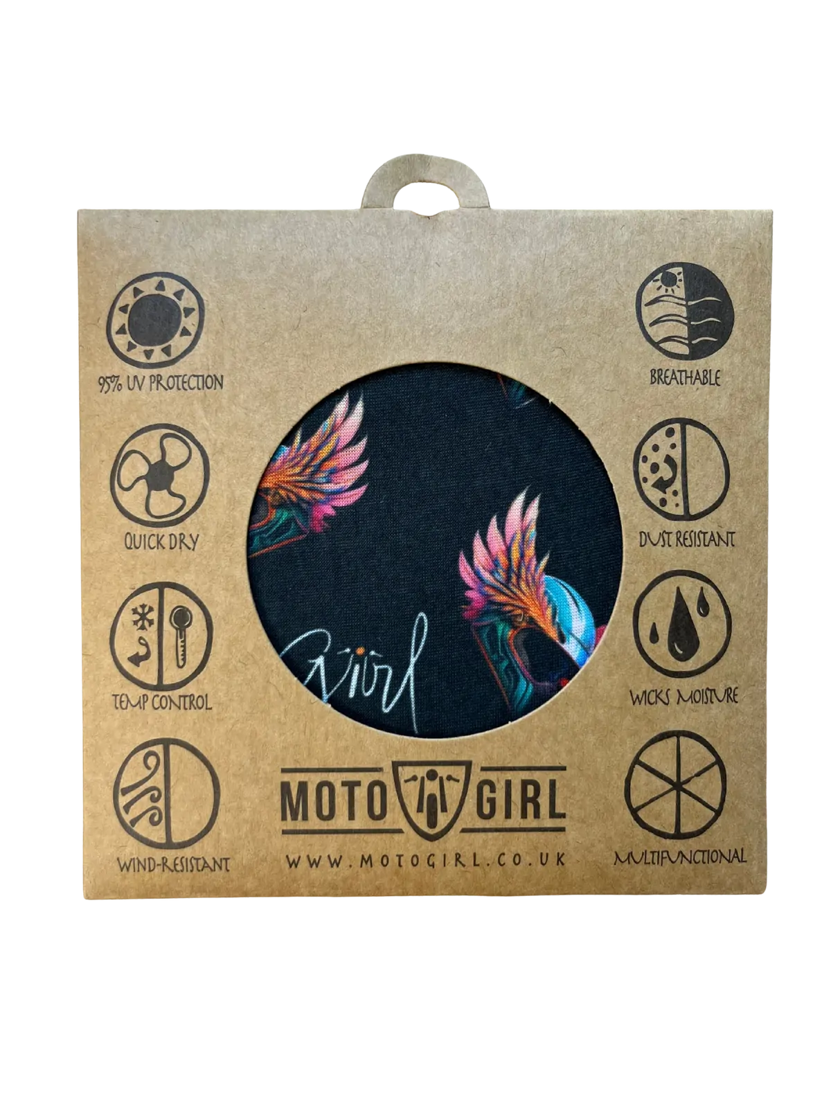 The Wings Neck Tube designed is the perfect classic black with a twist, inspired by women in motorcycling taking flight! The Neck Tube that has multiple different uses both on and off the bike! Use as Face mask, Headband, Cap, Neck Warmer and much more!