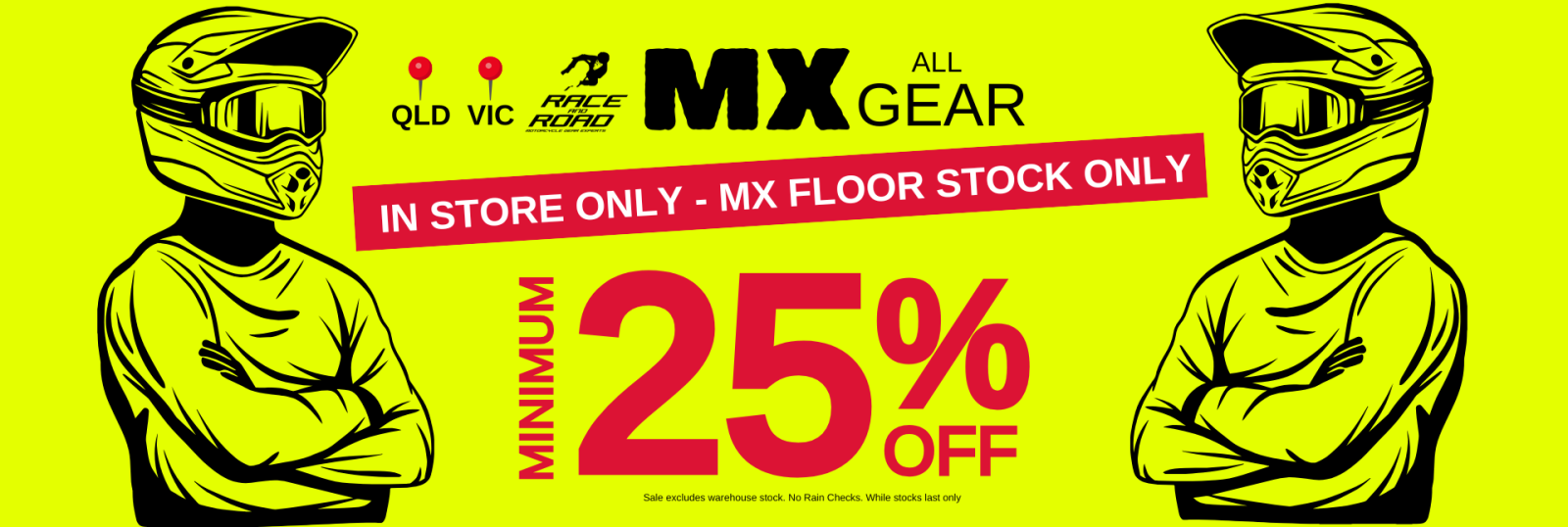 CURRENT "IN-STORE ONLY" PROMOTION: 25% TO 60% OFF all MX Gear in-store only. ps: These deals are too hot to be shown online. Grab a red-hot clearance price deal in-store now. Available in-store only at Archerfield, Brisbane and Dandenong South, Melbourne, or while stocks last - Open 7 days. Click here for our store locations.
